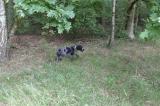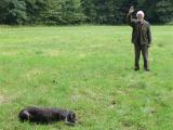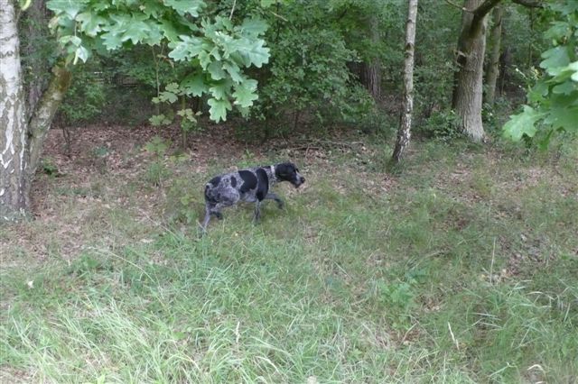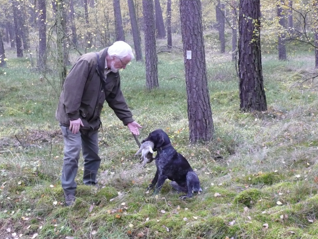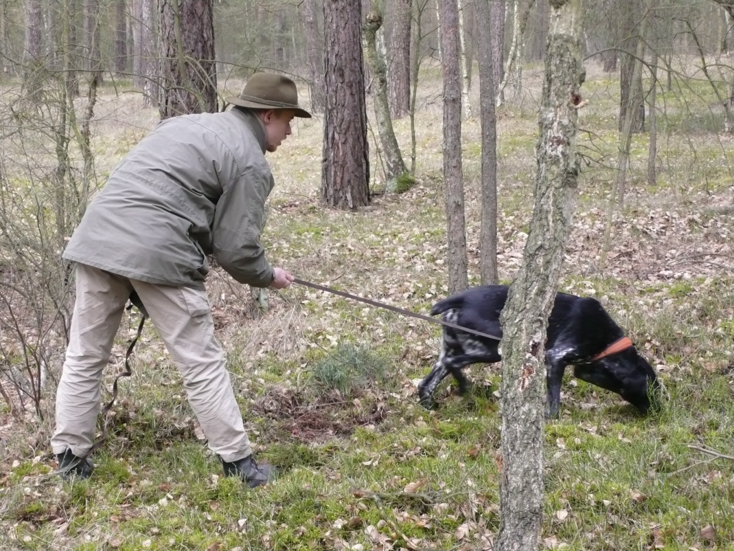 (7) Es wird nur reine Riemenarbeit geprüft. Jeder Hund muss an einer gerechten Schweißhalsung am mindestens sechs Meter langen Schweißriemen geführt werden, der dem Hund in voller Länge zu geben ist. Die Richter weisen den Führer in den Anschuss ein und geben die Fluchtrichtung an.